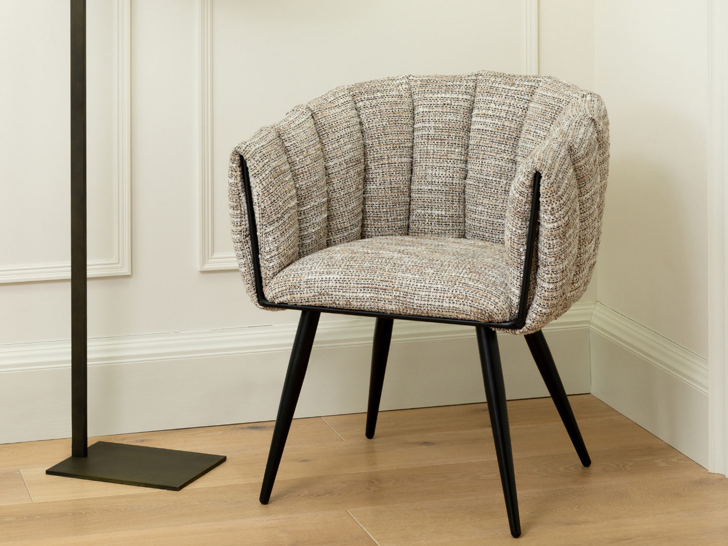 The Haddington Chair offers a refined balance of comfort, sculptural form, and contemporary style. Upholstered in a subtly textured neutral fabric, the chair features a signature channeled backrest that curves around the seat, providing both visual interest and supportive comfort. Tapered wooden legs in...- €249.00