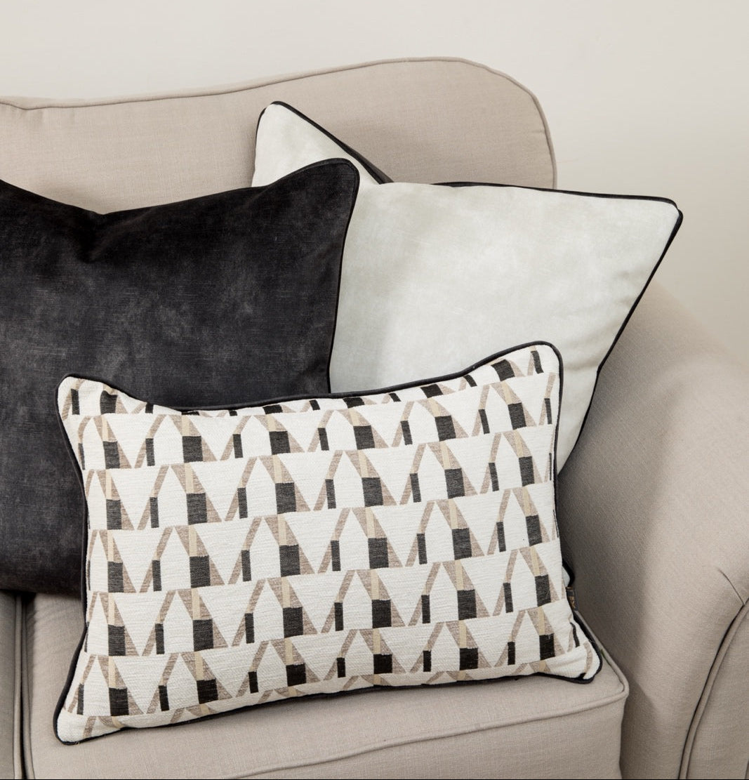 Bring bold design and modern artistry into your home with the Odessa Cushion. Showcasing a captivating arrangement of elongated geometric shapes, this handcrafted piece offers a dynamic interplay of form and tone, creating a striking focal point in any space. The cut-velvet surface on...- €55.00
