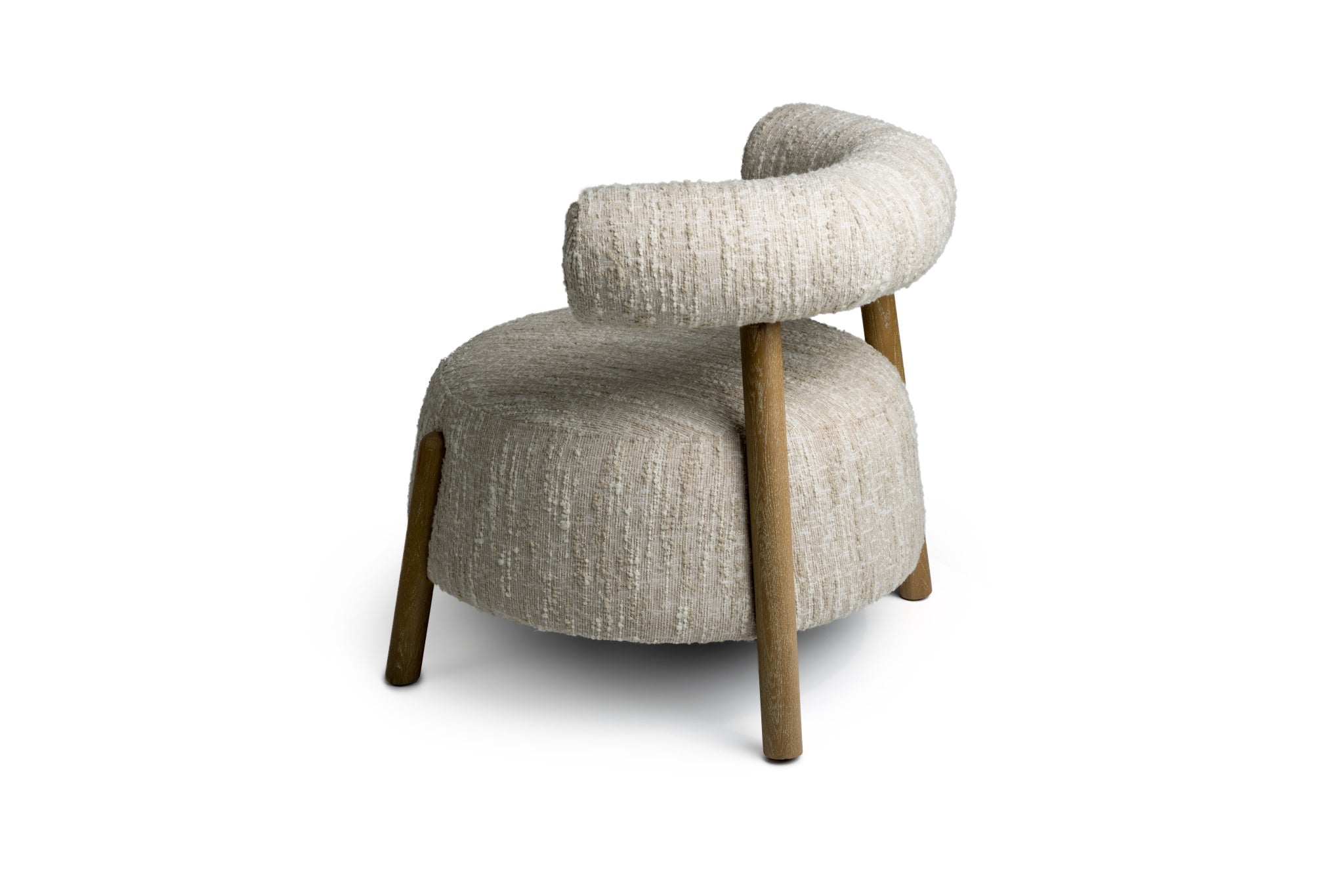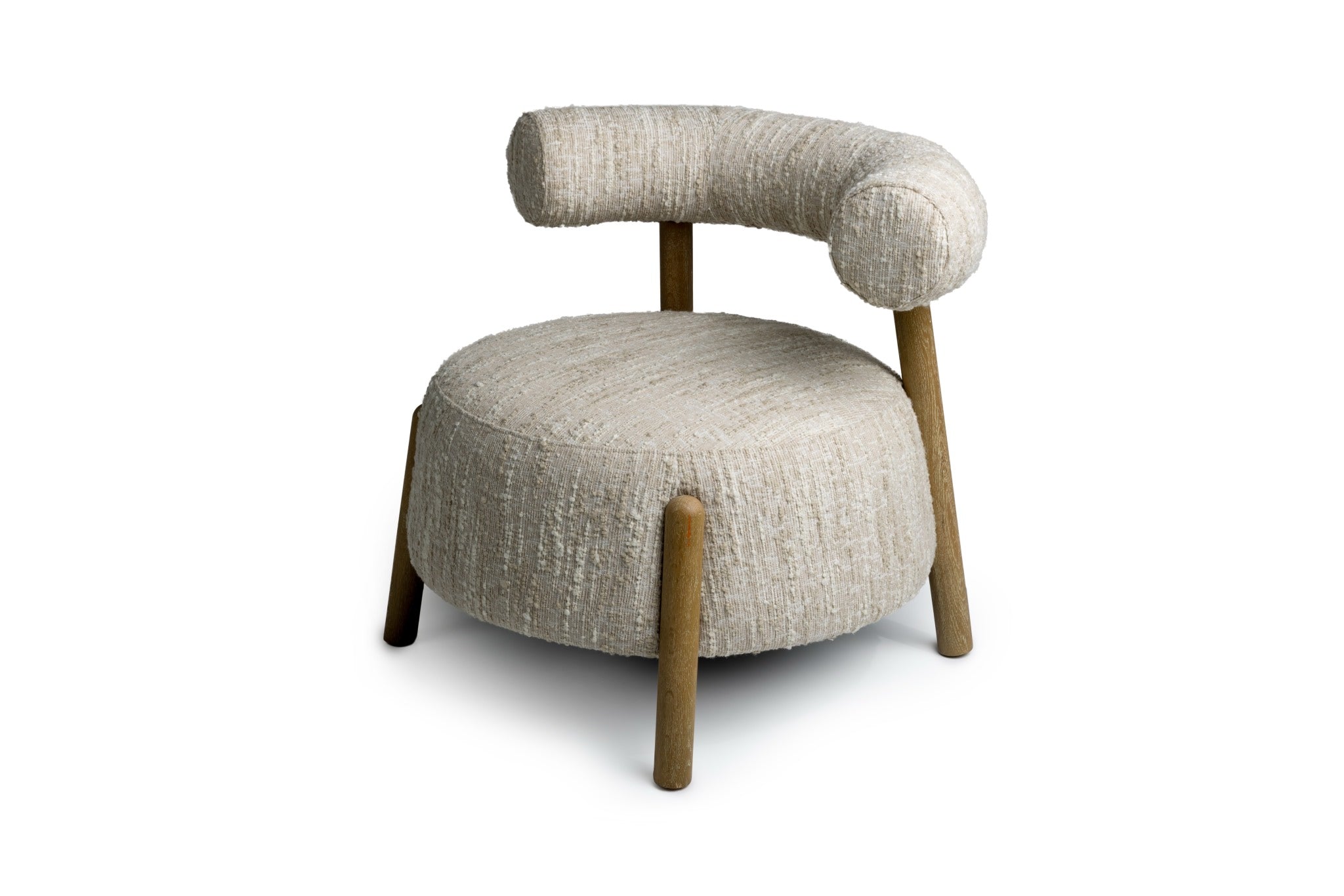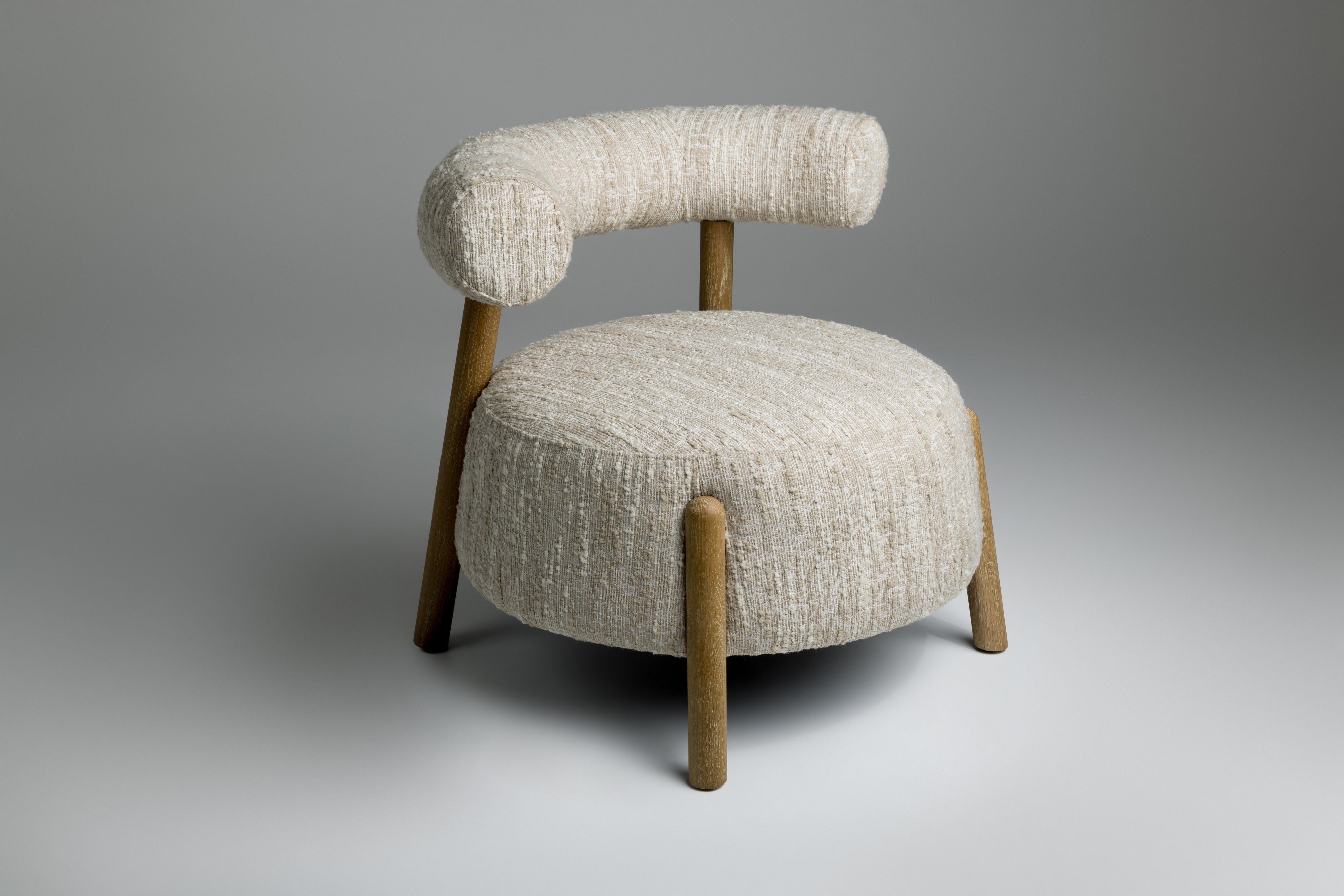 The Adina Chair is a sculptural accent chair that perfectly balances contemporary form with inviting comfort. Upholstered in a beautifully textured fabric, it features a rounded seat and cylindrical backrest set on splayed wooden legs, creating a statement silhouette that offers both visual impact and ergonomic support.
