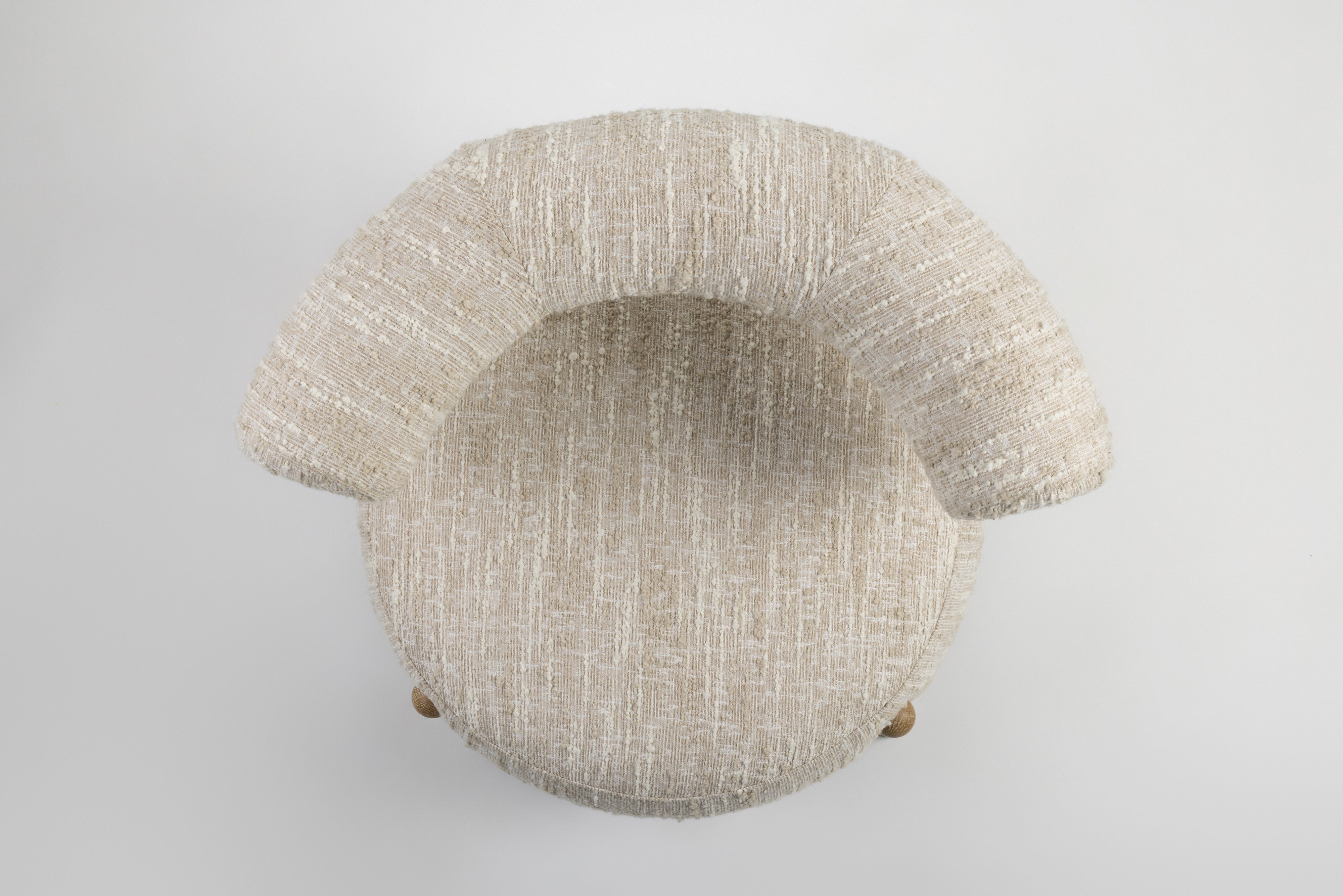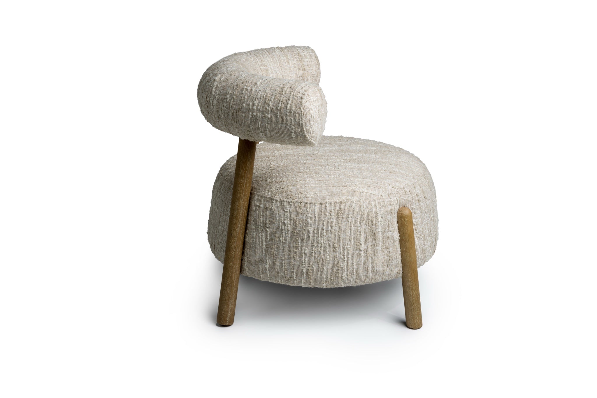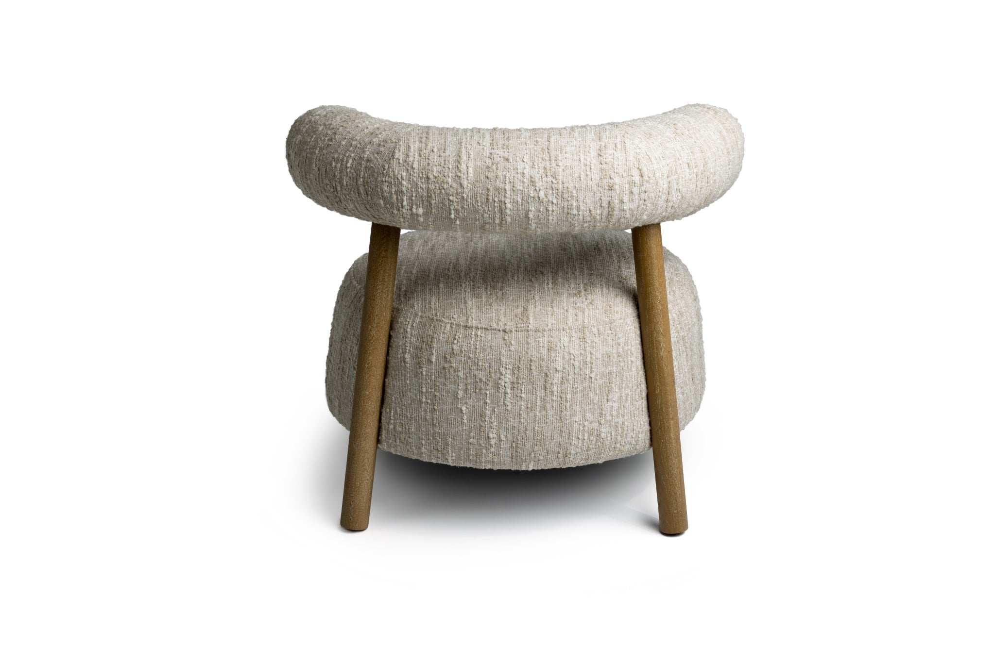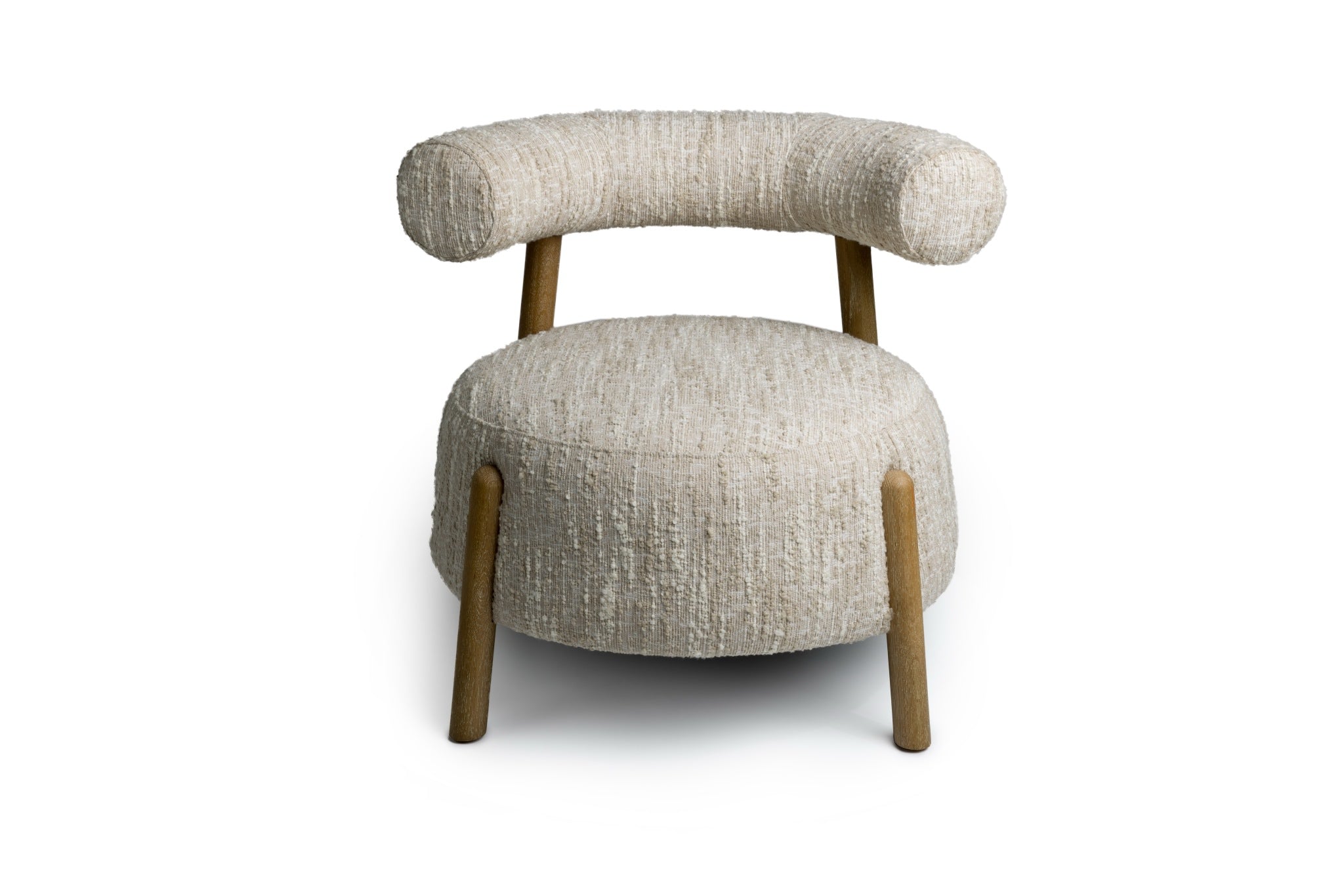 The Adina Chair is a sculptural accent chair that perfectly balances contemporary form with inviting comfort. Upholstered in a beautifully textured fabric, it features a rounded seat and cylindrical backrest set on splayed wooden legs, creating a statement silhouette that offers both visual impact and ergonomic support.