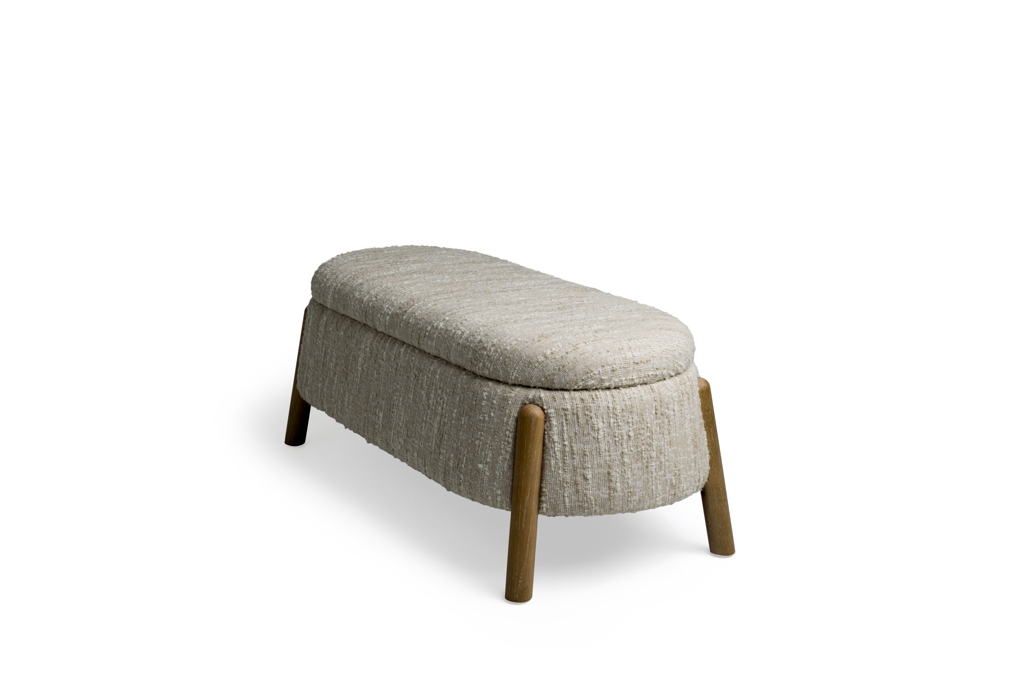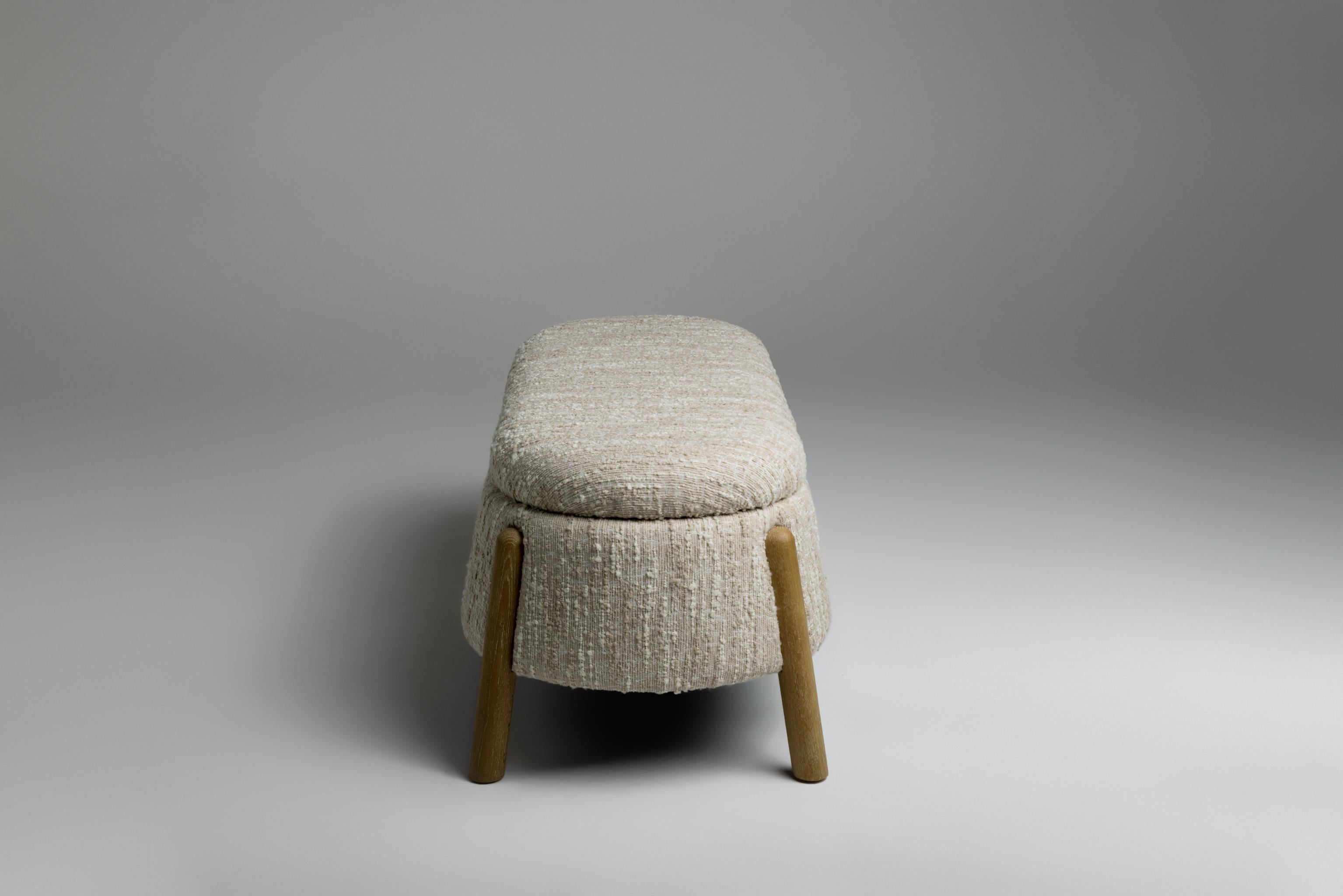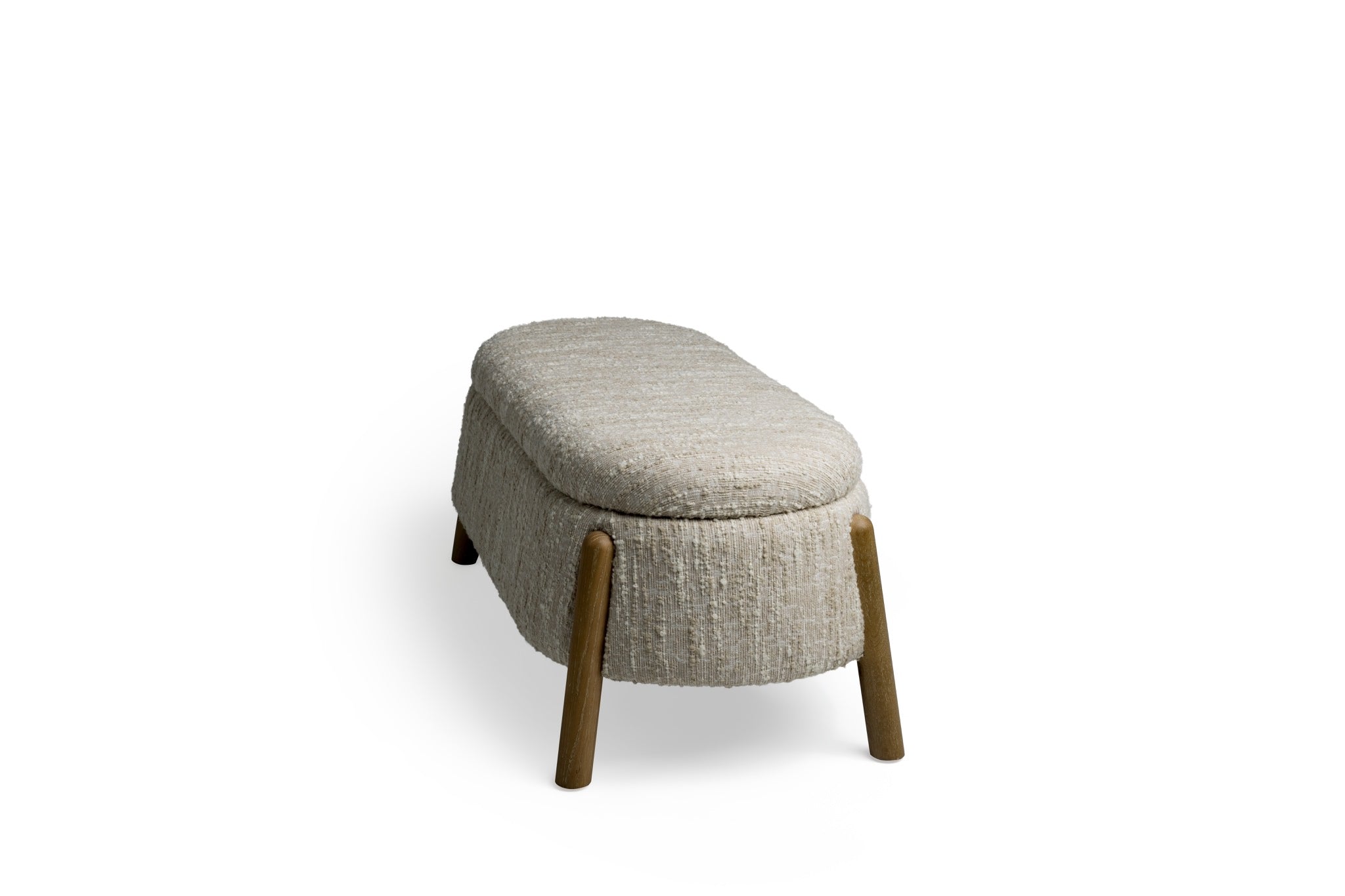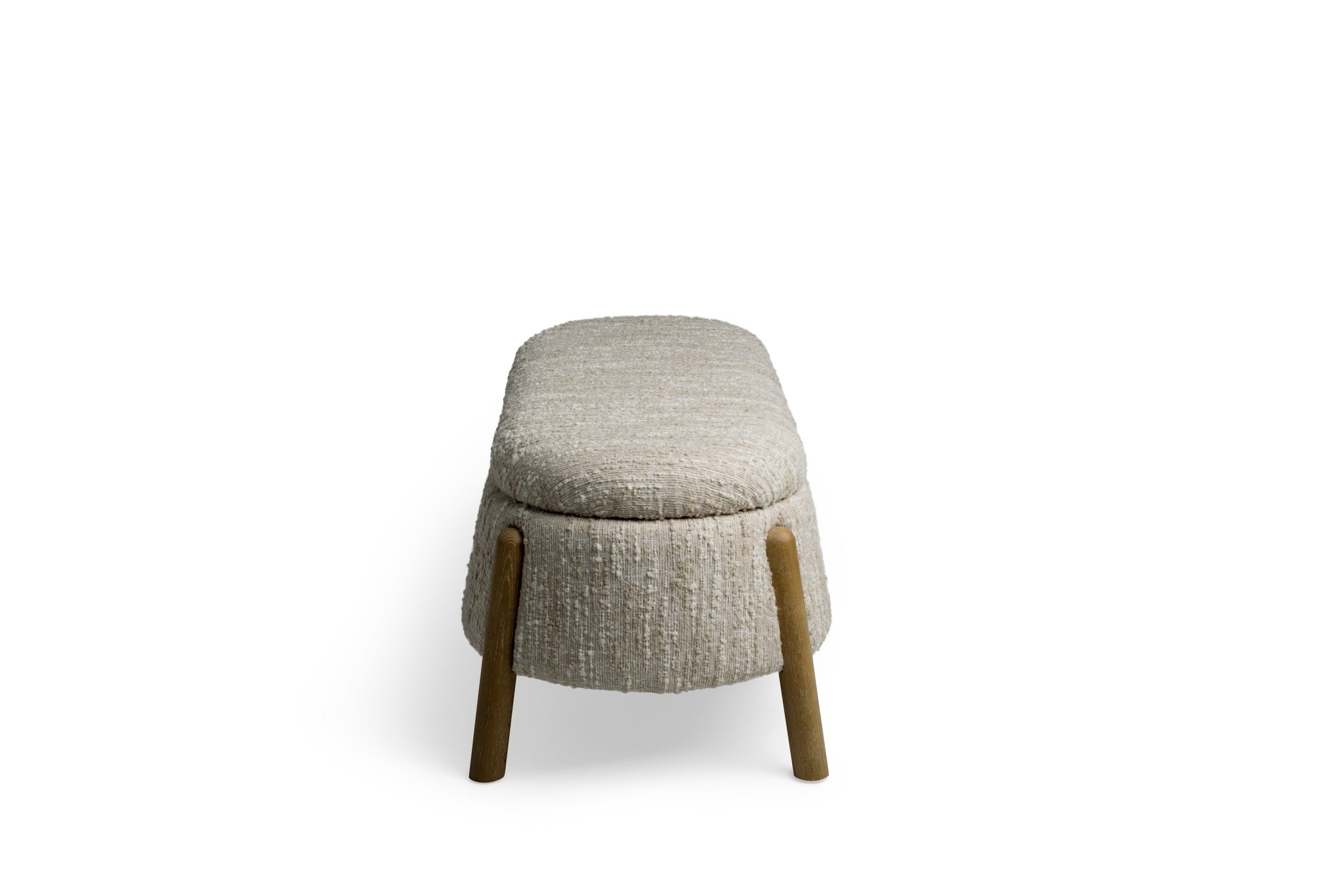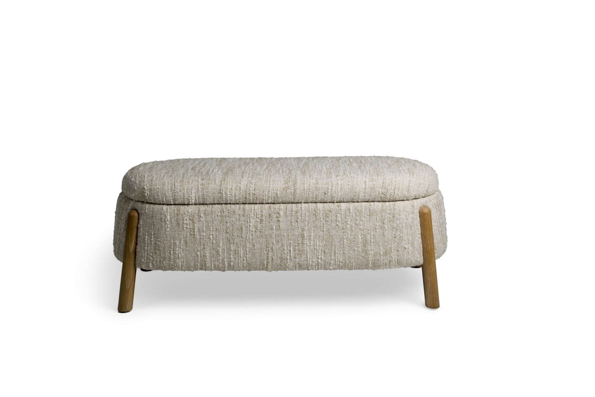 The Adina Ottoman combines sculptural simplicity with everyday functionality. Upholstered in a richly textured bouclé fabric, its softly rounded edges and elongated form bring a calming, cohesive presence to modern interiors. Solid wooden legs provide an organic foundation, balancing its plush design with refined warmth.