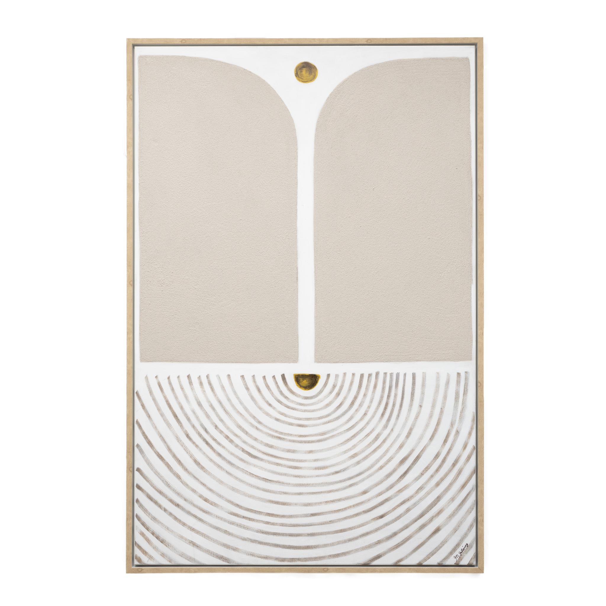 Minimalist in form but rich in impact, Anders is a modern abstract artwork that brings balance and calm to any space. Featuring a symmetrical design with soft natural tones, this piece invites a sense of harmony into your home. Arched shapes and concentric linework are highlighted by golden accents, creating a focal point that's both peaceful and visually striking.