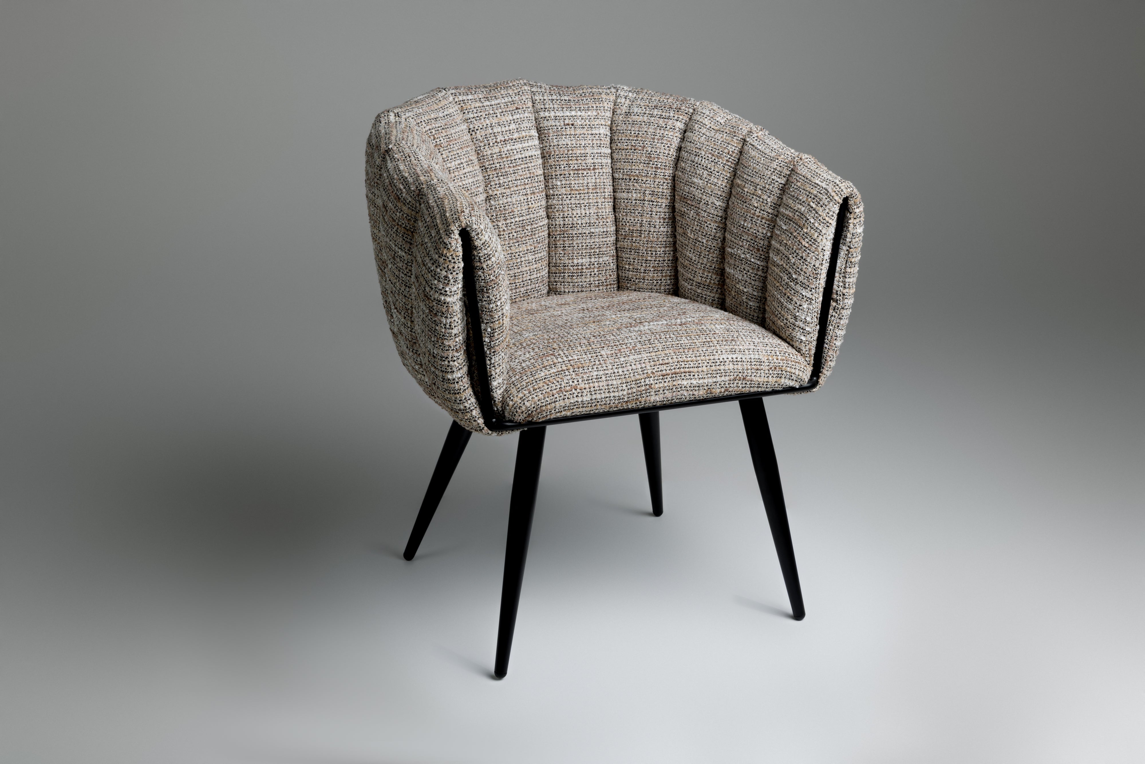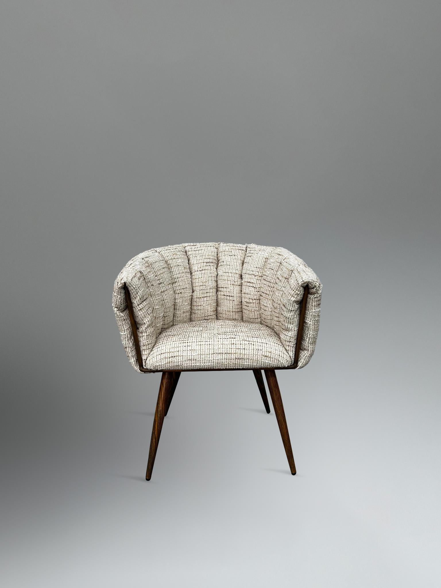 The chair’s slender, tapered wooden legs with a golden undertone bring subtle contrast and sophistication, making it ideal for use in curated living spaces, bedrooms, dining areas, or boutique interiors. Whether styled solo or in pairs, Bexley enhances any space with its sculptural silhouette and warm neutral palette.