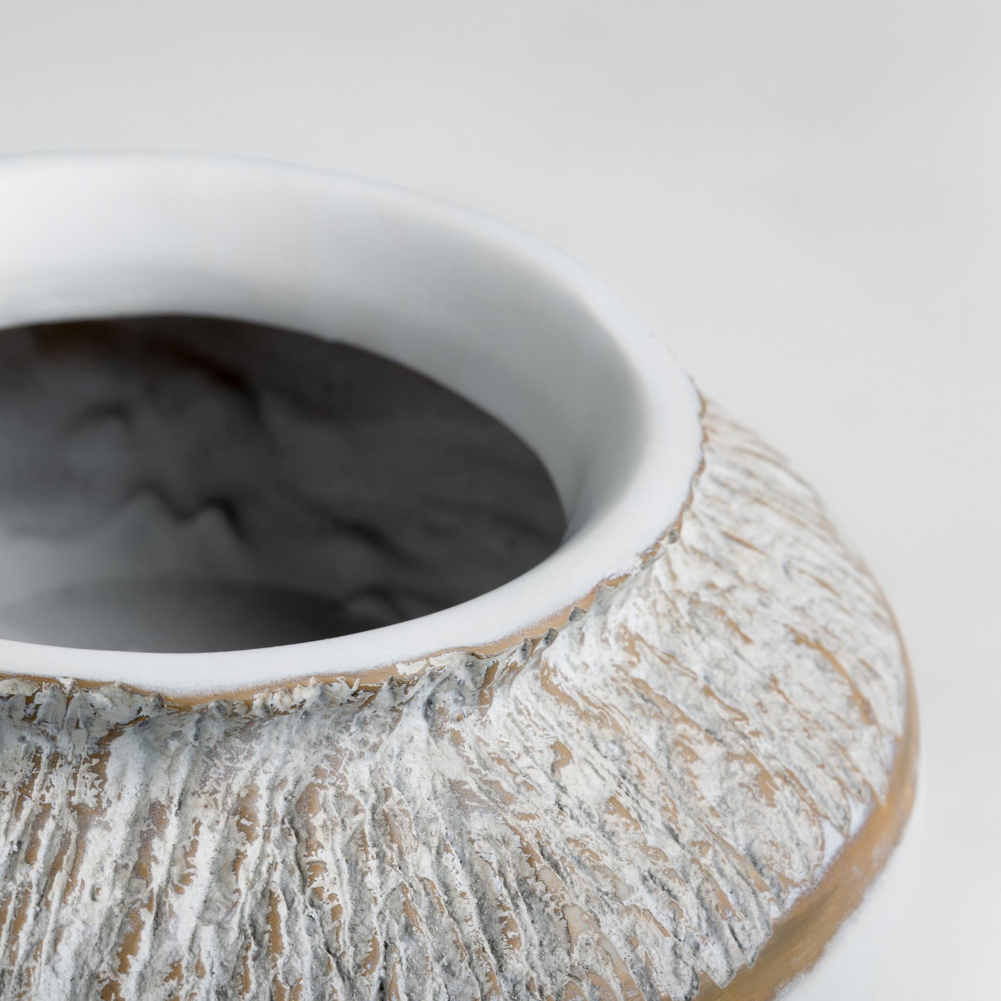 The vase features a low, gently curved profile with a matte white body and a hand-finished, textured upper rim in chalk white and earthy taupe tones. The raw, organic detail creates depth and visual interest, making it an eye-catching accent for coffee tables, shelving, or dining areas.