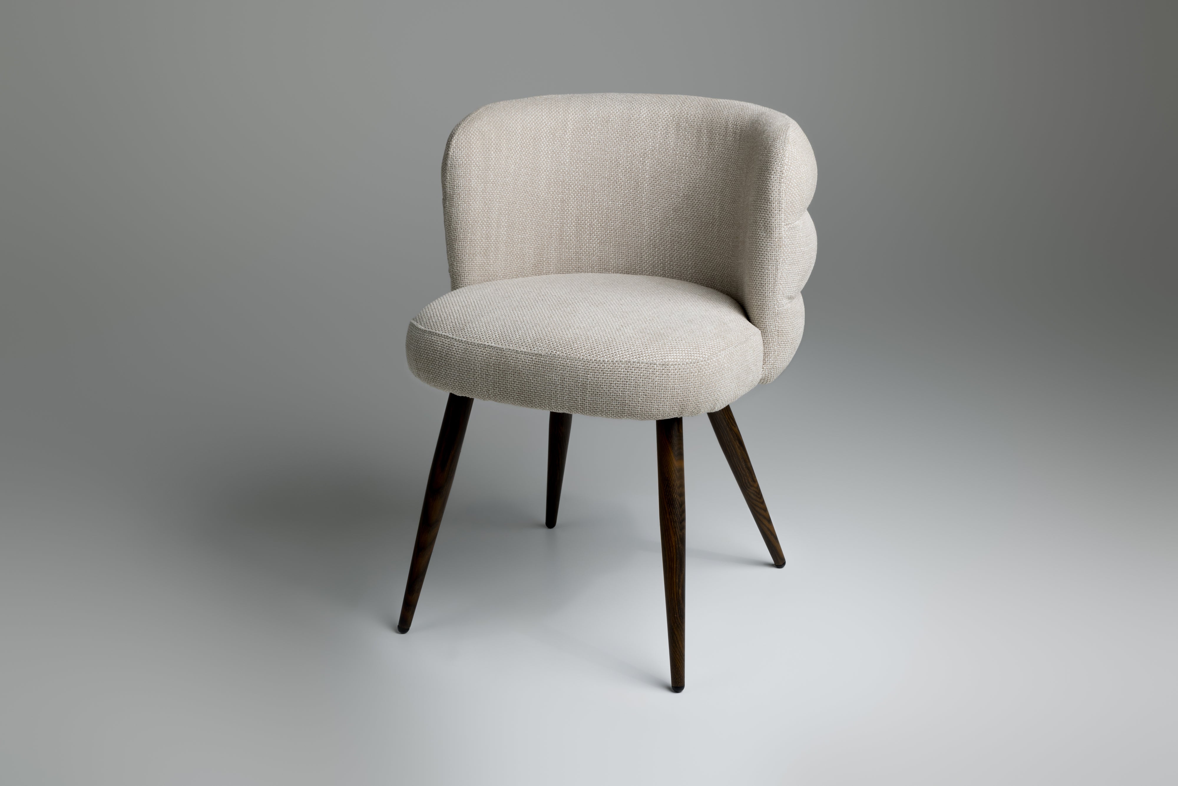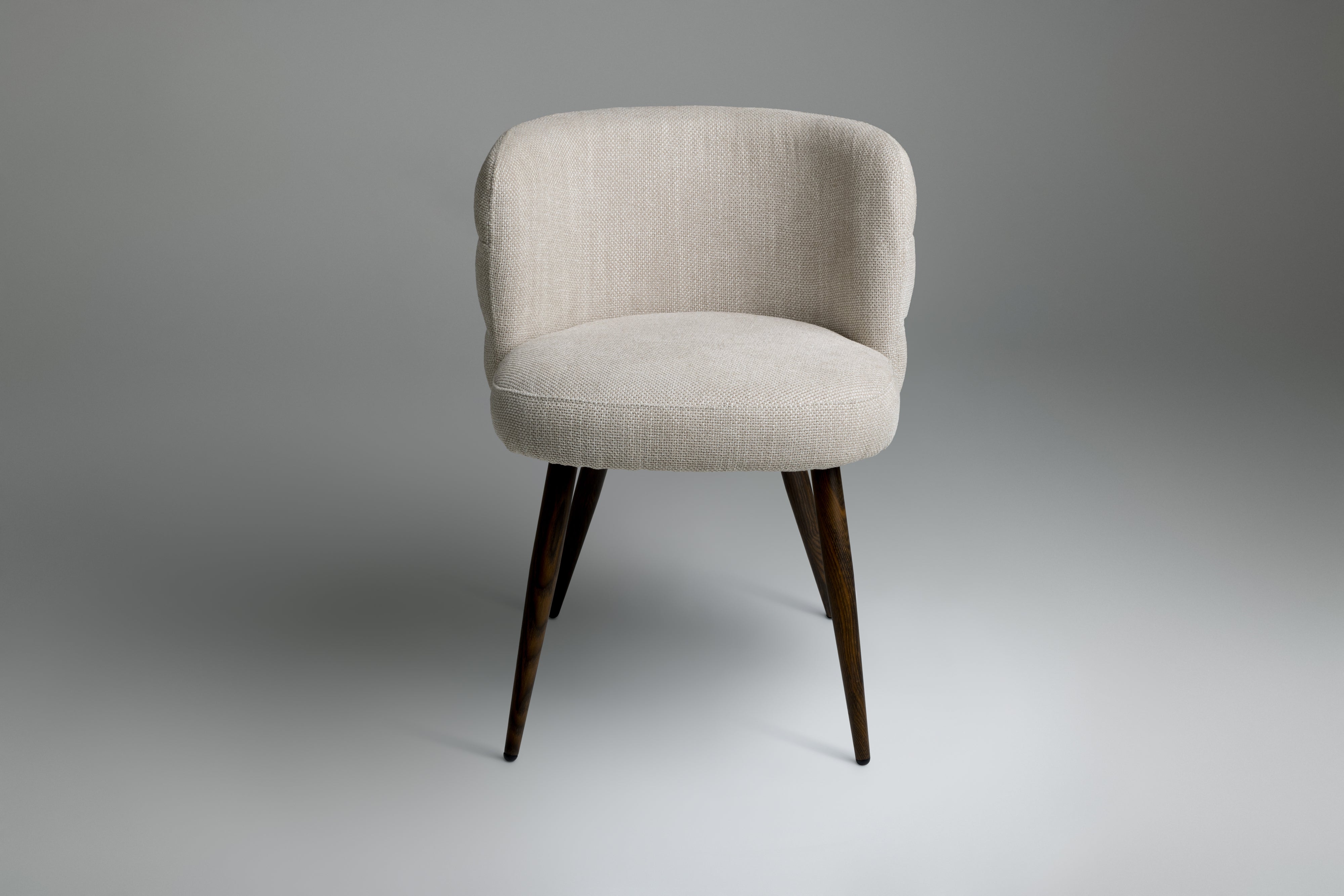 Tapered wooden legs in a rich walnut stain elevate the design with mid-century influence, making it a versatile addition to curated dining areas, living spaces, or boutique bedrooms. The Haddington Chair is a seamless blend of soft tactility and structured elegance—perfect for modern interiors.