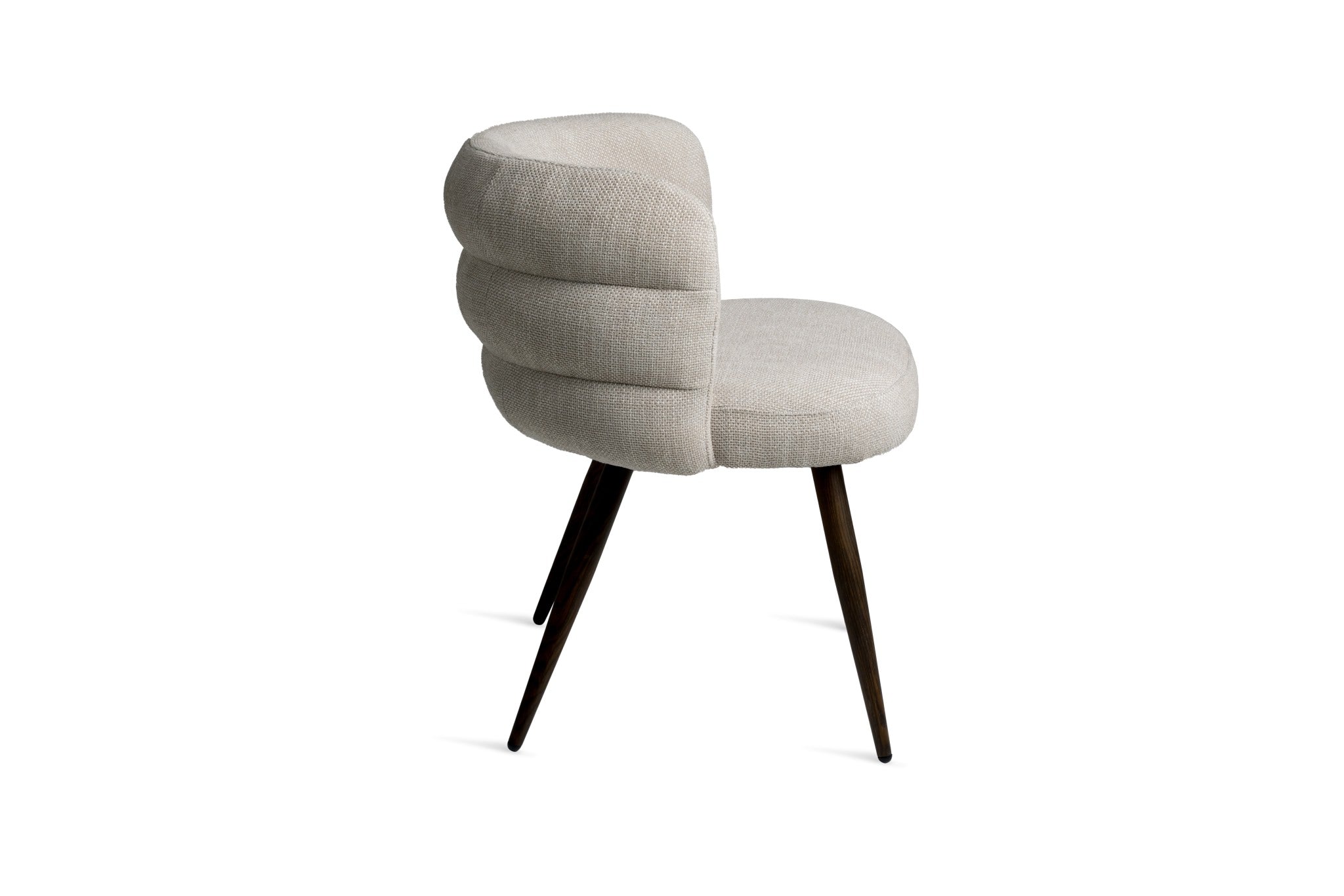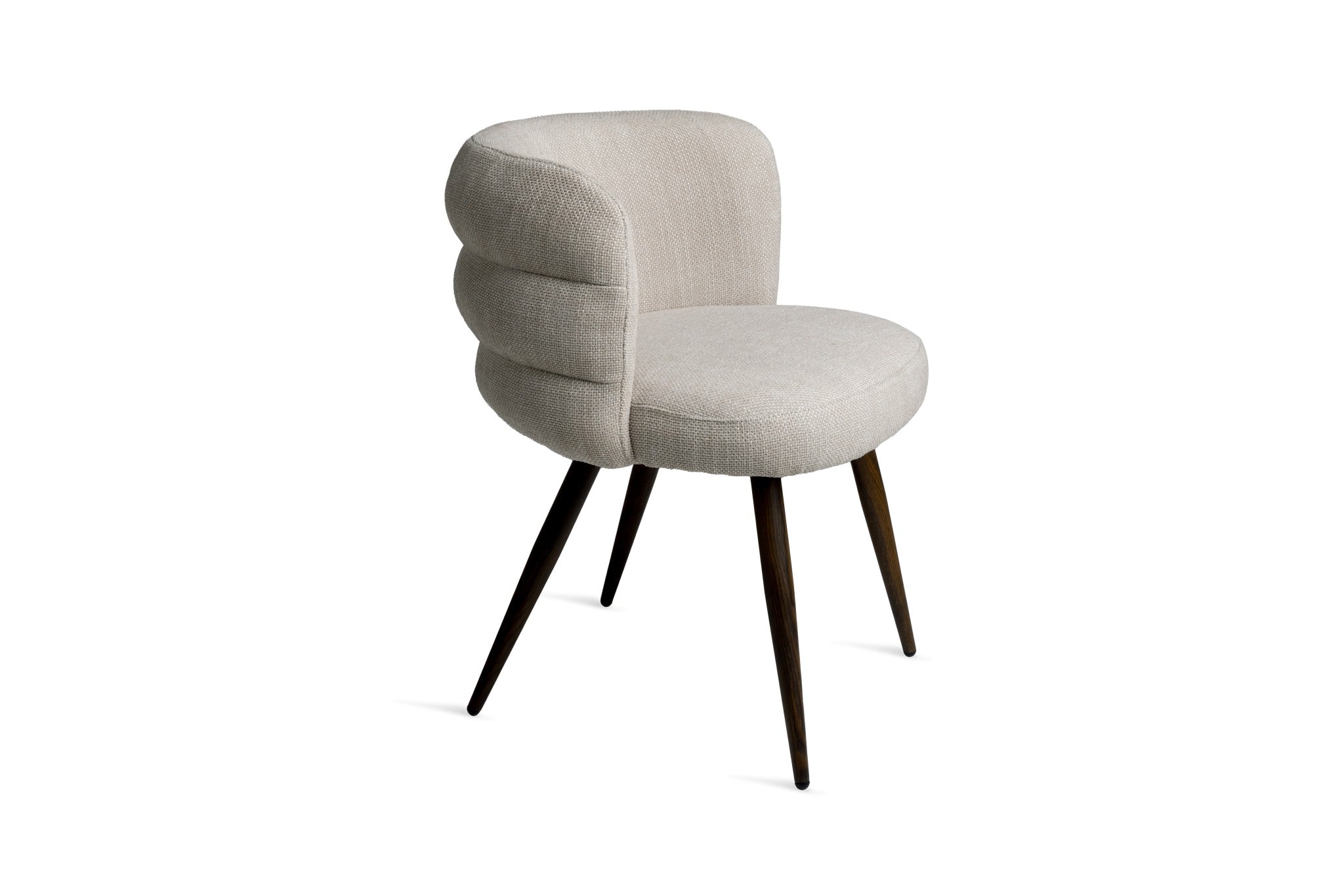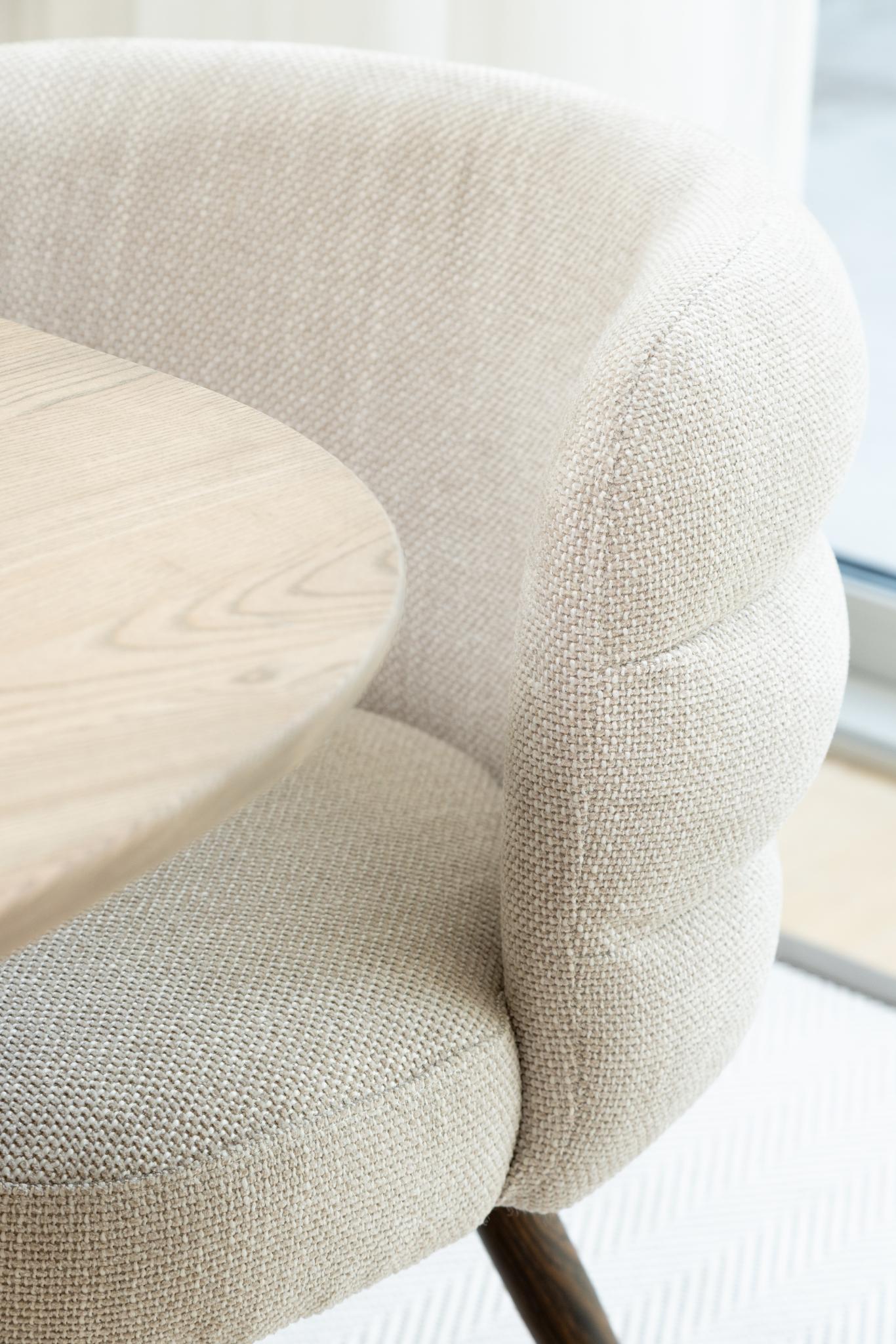 The Haddington Chair offers a refined balance of comfort, sculptural form, and contemporary style. Upholstered in a subtly textured neutral fabric, the chair features a signature channeled backrest that curves around the seat, providing both visual interest and supportive comfort.