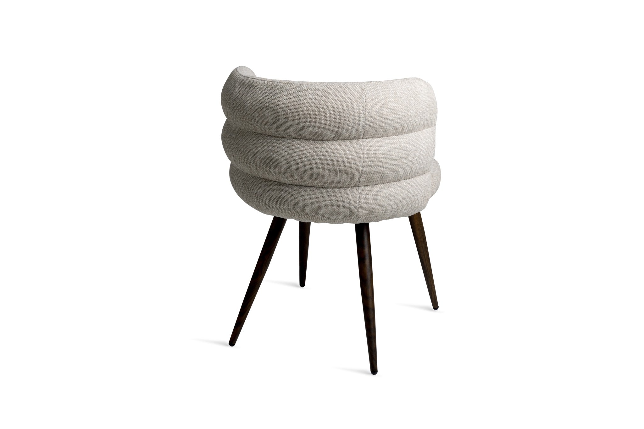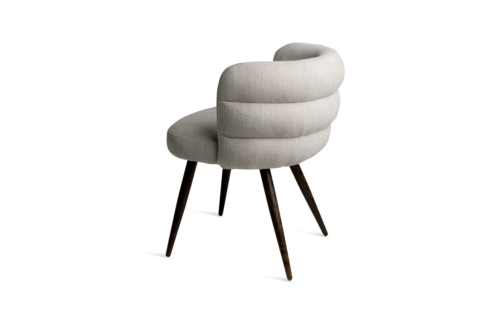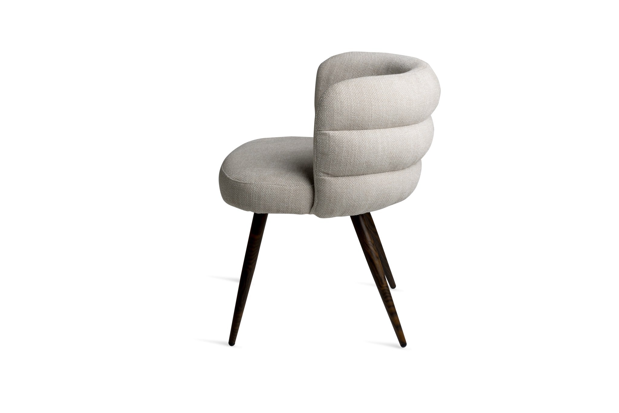 The Haddington Chair offers a refined balance of comfort, sculptural form, and contemporary style. Upholstered in a subtly textured neutral fabric, the chair features a signature channeled backrest that curves around the seat, providing both visual interest and supportive comfort.