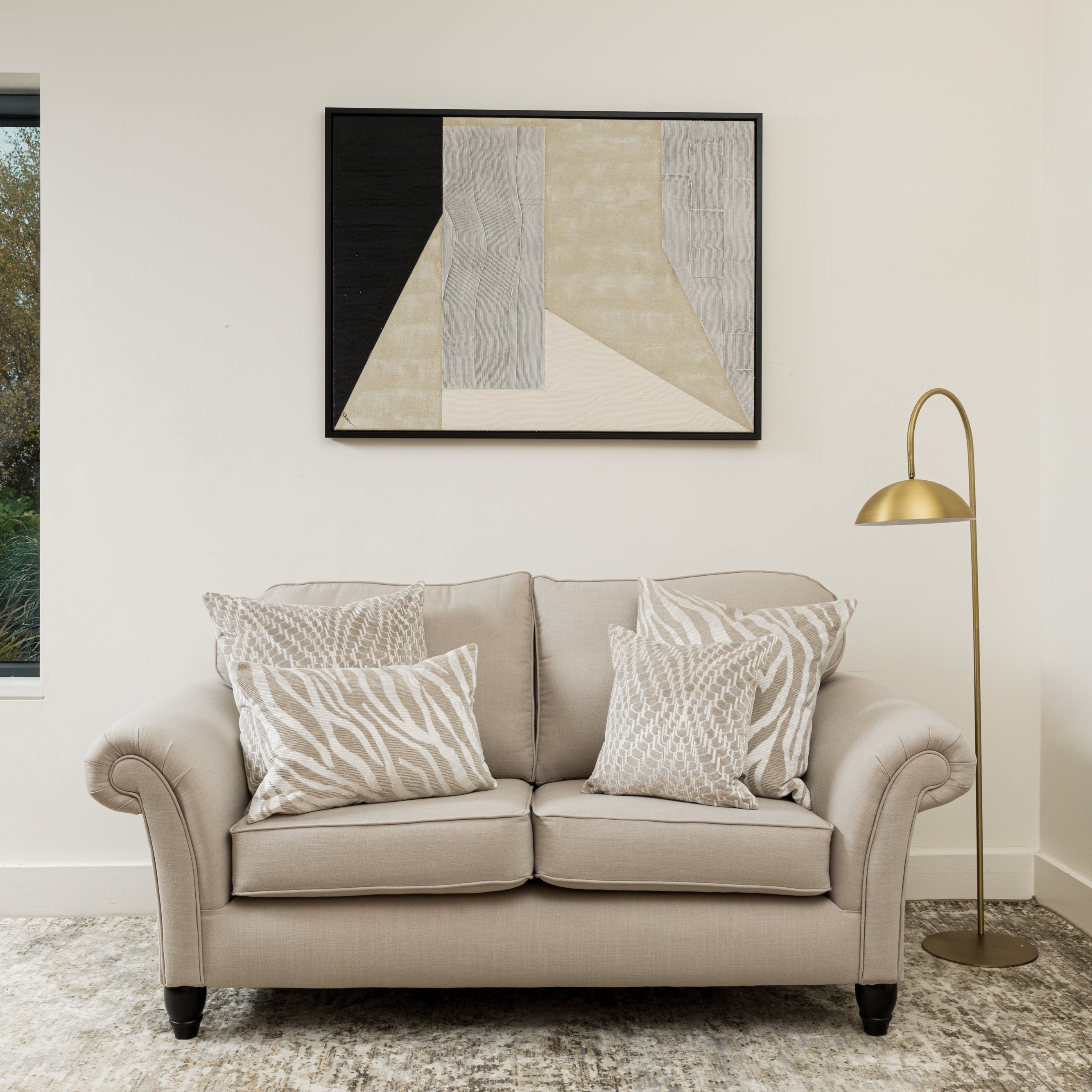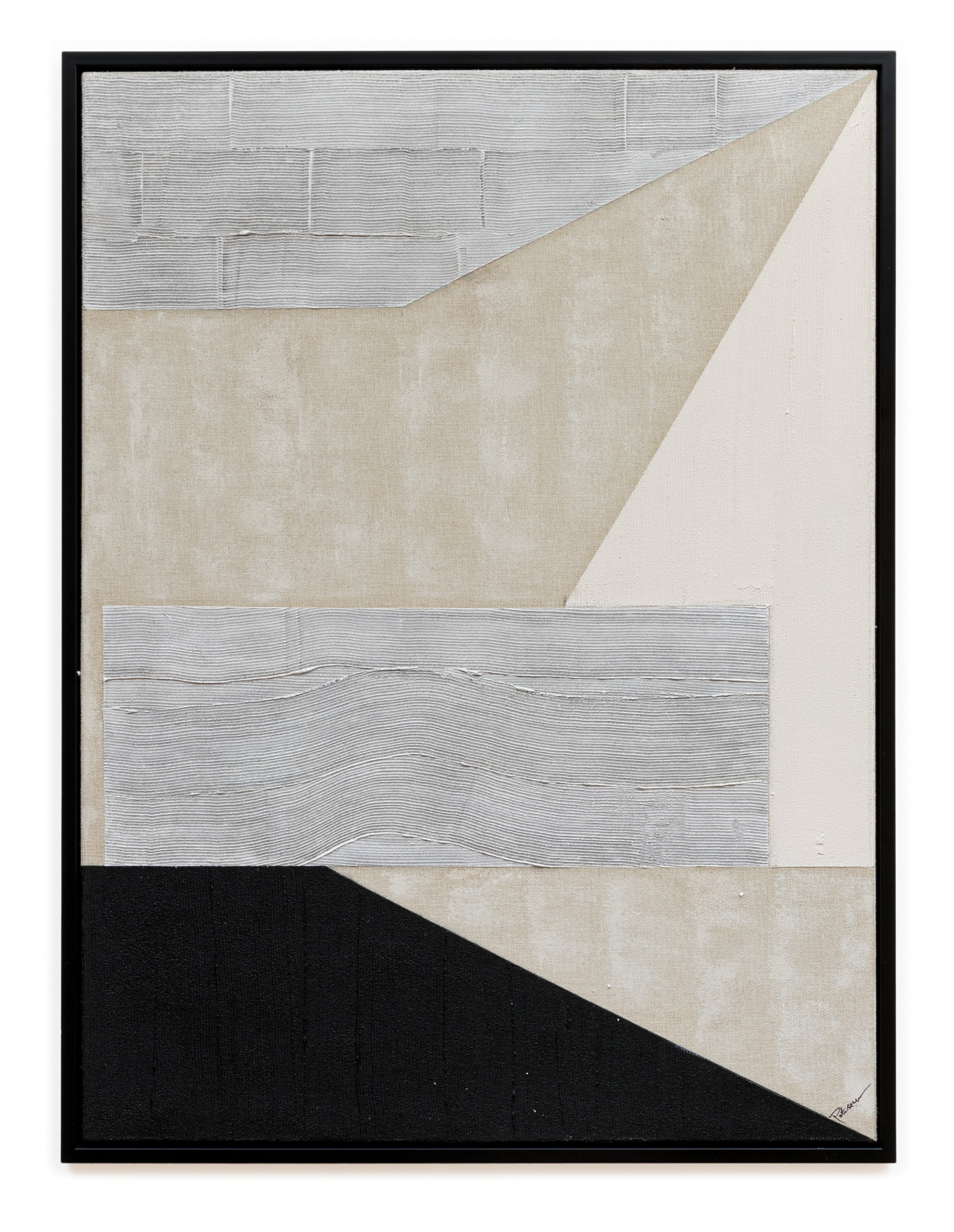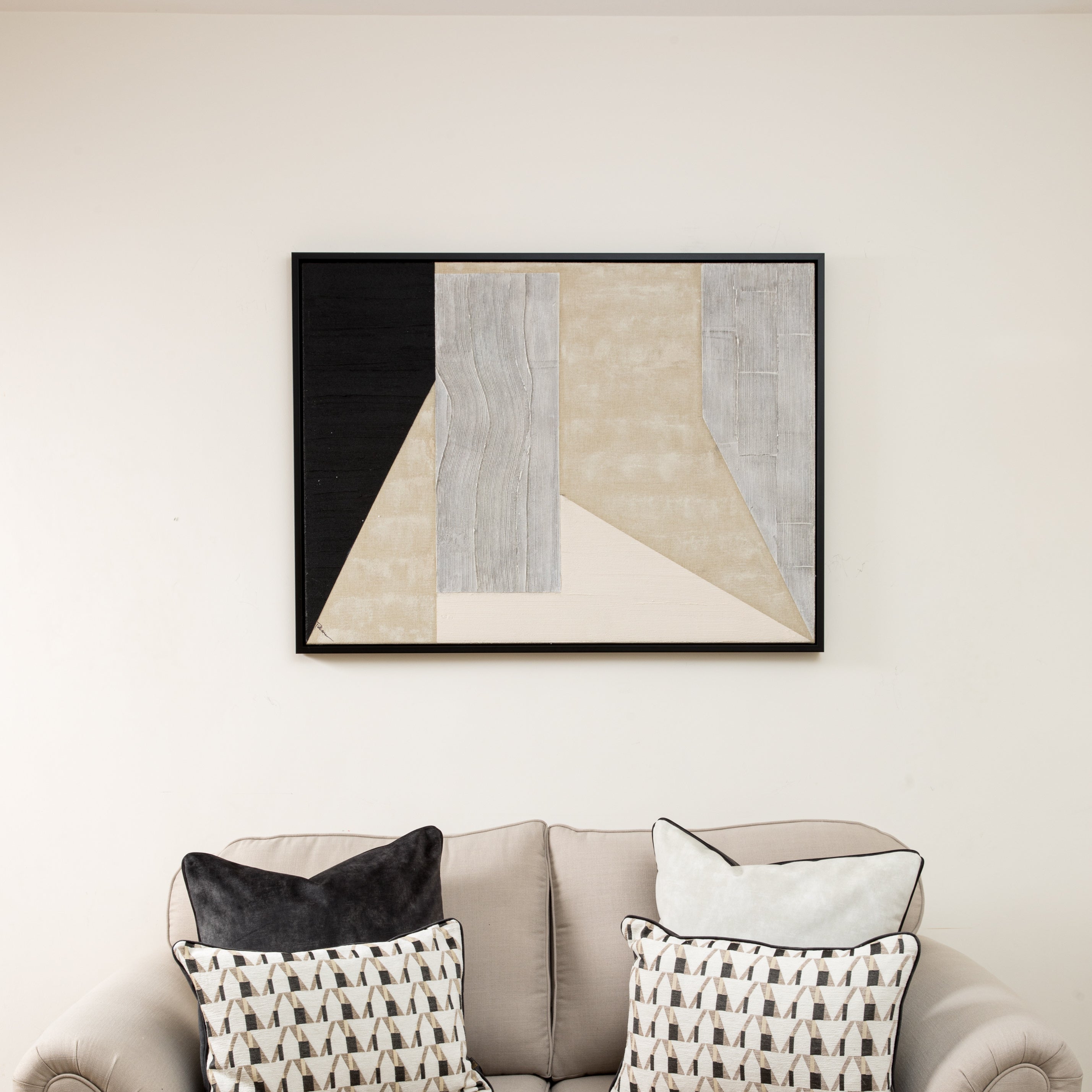 Uplift your home décor with Kempton, a striking geometric wall art piece that blends bold design with a refined neutral palette. Crafted with a hand-painted finish on a textured linen base, this artwork uses sand gel and matte acrylic to create depth and tactile appeal. The composition features a balance of angular and organic forms in shades of stone, sand, cream, and black, resulting in a sophisticated yet minimalist look. Finished in a contemporary black floating frame and designed for two-way hanging, Kempton is ideal for modern interiors seeking clean lines and gallery-style impact.