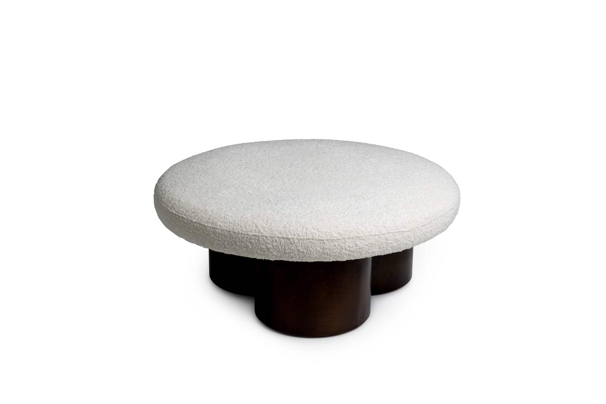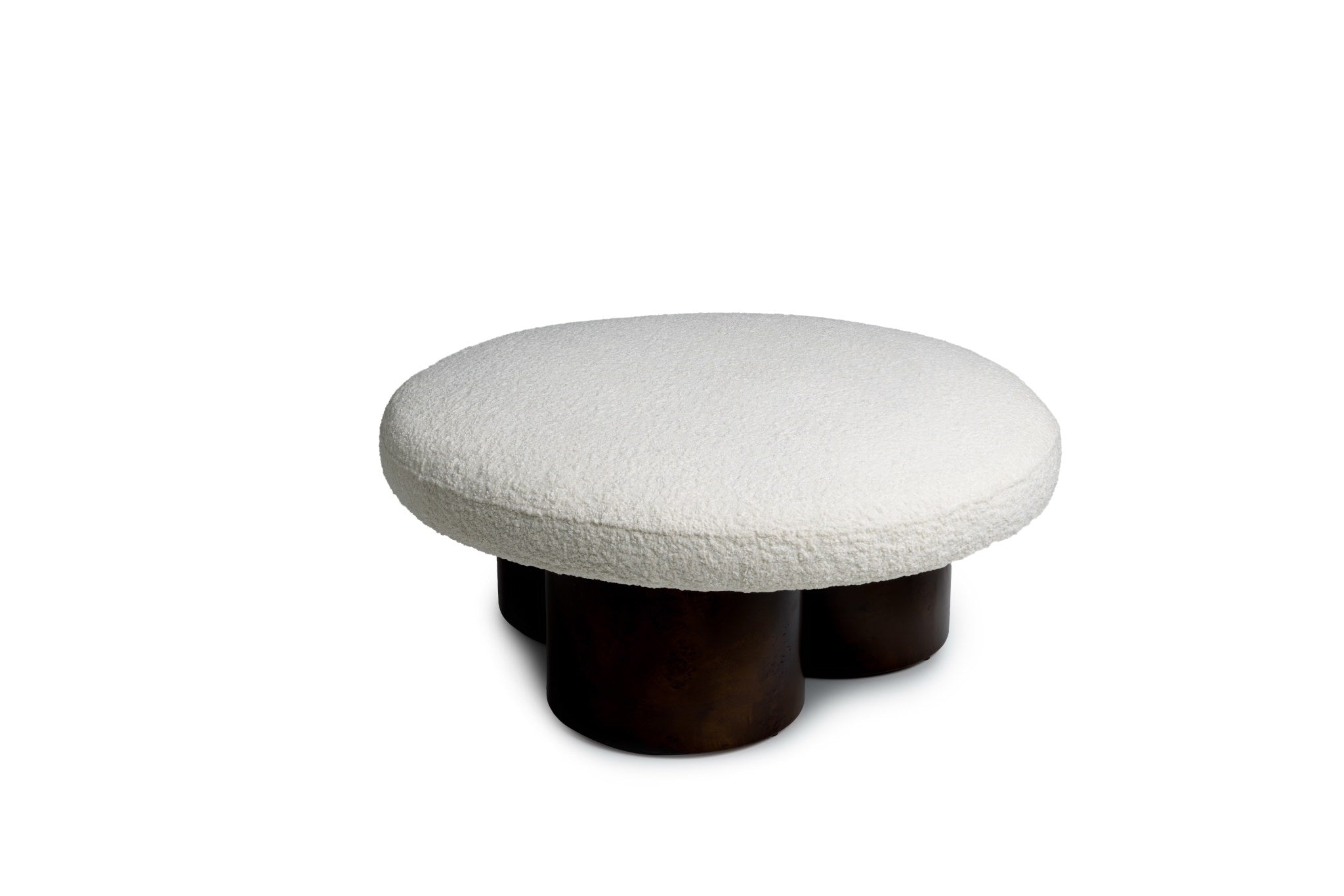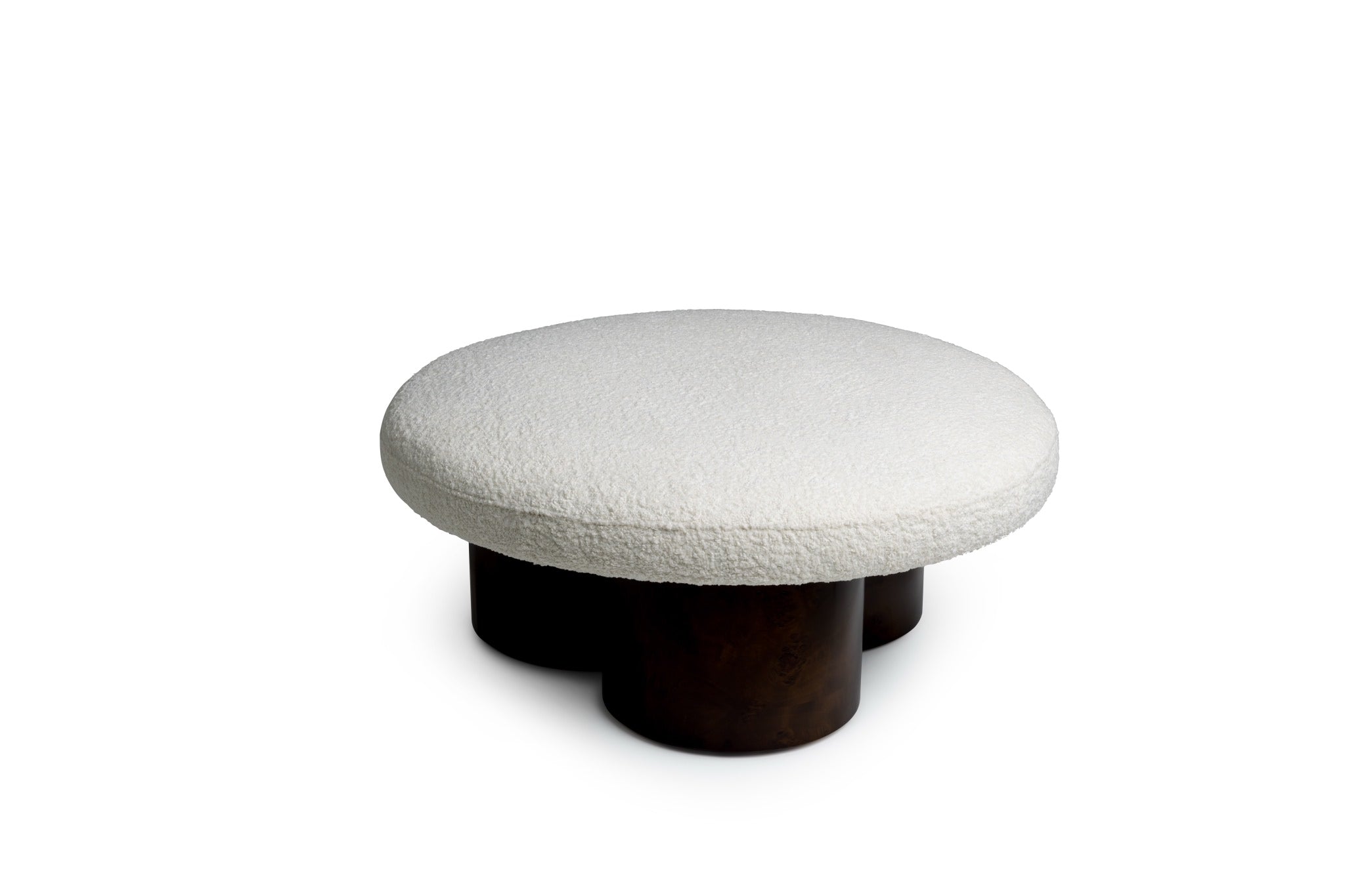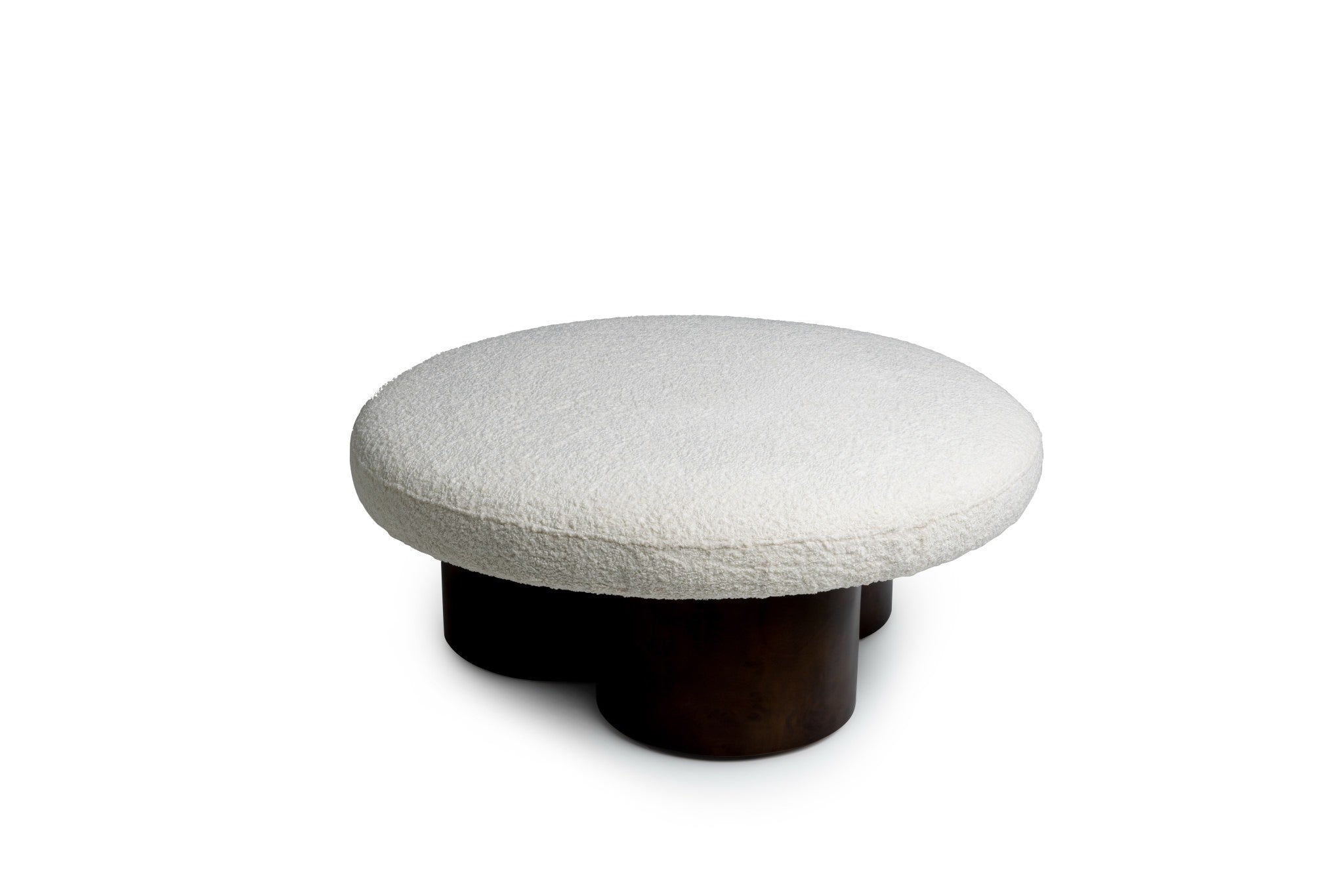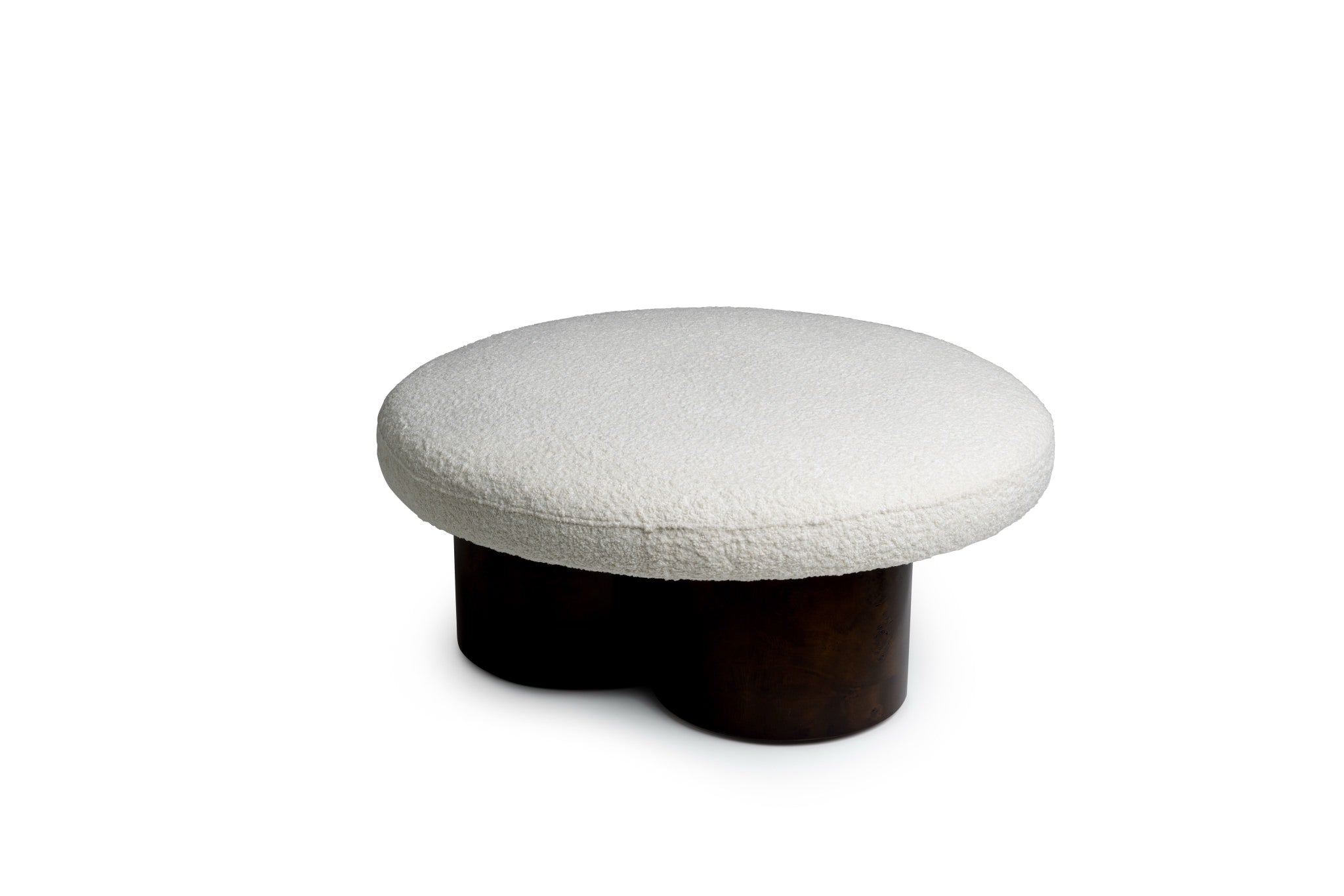 The Sutton Ottoman brings together sculptural form and tactile softness in a refined, contemporary design. Upholstered in a rich bouclé-textured fabric, the generously padded circular top rests on a trio of rounded dark-stained bases, creating a bold yet balanced silhouette.