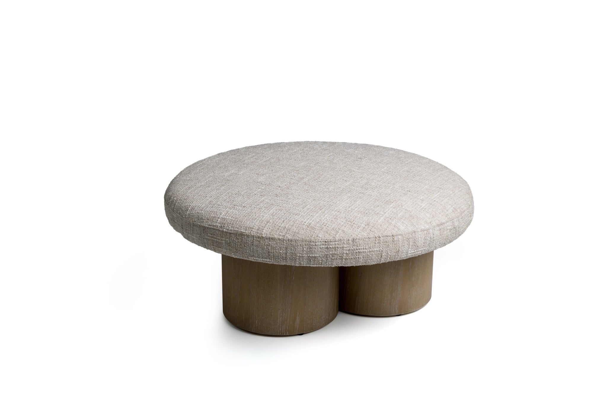 The Treva Ottoman in Natural is a statement in sculptural softness and organic form. Upholstered in a textured neutral fabric, its generously padded circular seat rests on a trio of cylindrical legs in a light wood finish, creating a bold yet balanced foundation.