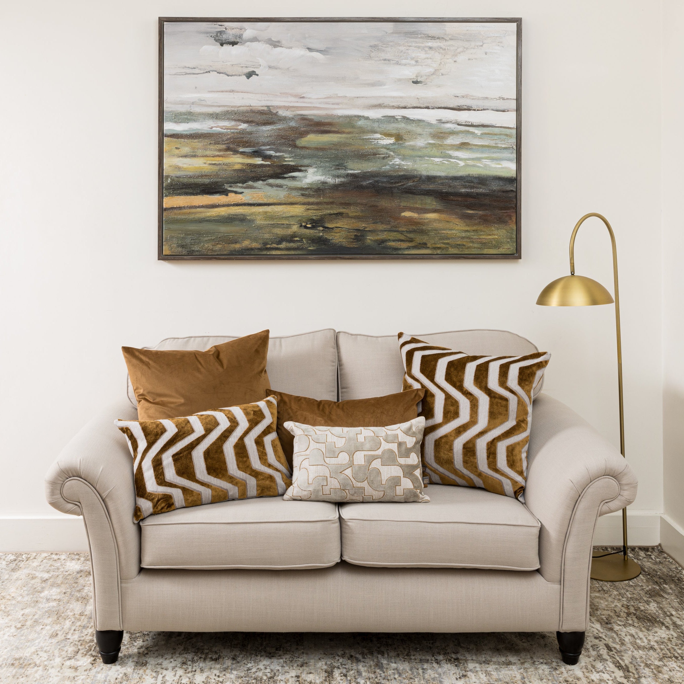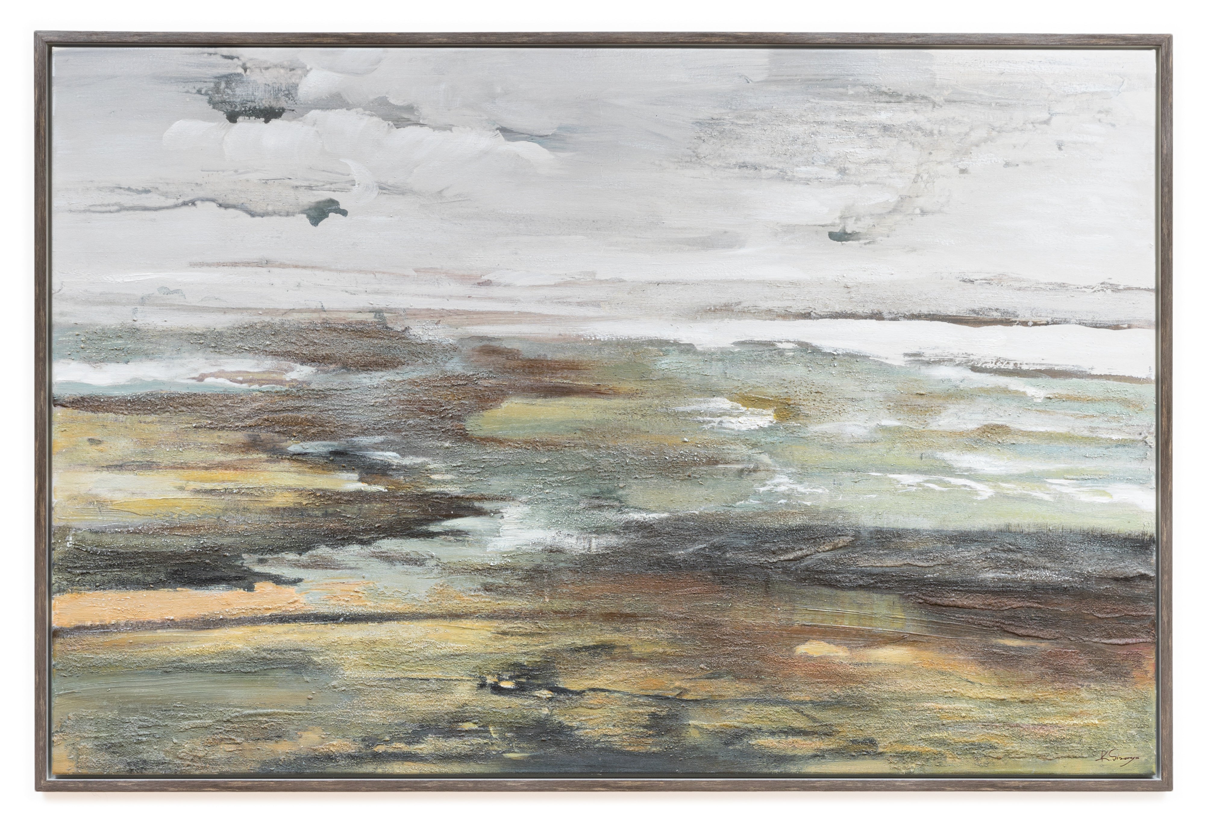 Wylder Green is a richly textured landscape painting that brings earthy elegance and natural depth to your interior. Crafted using sand gel and modelling paste, this hand-painted piece features an atmospheric blend of green, amber, and charcoal tones. The layered surface adds dimension and movement, evoking the feel of rural terrain under shifting skies. Framed in a contemporary dark floating frame, Wylder Green makes an ideal focal point above a living room sofa, dining sideboard, or hallway console—perfect for traditional and transitional interiors alike.