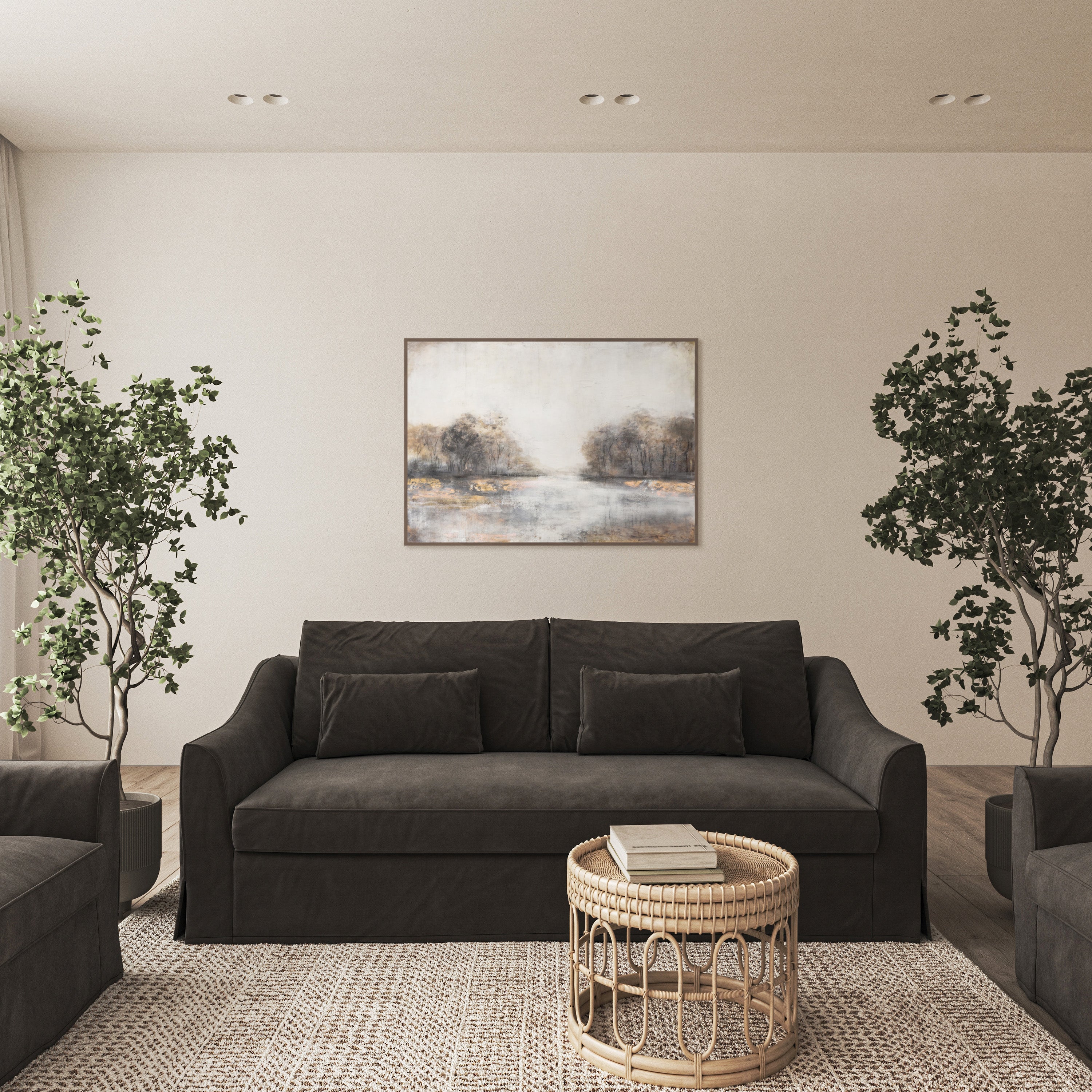 Bring a sense of calm and balance into your home with Wynton, a tranquil hand-painted landscape that reflects the serene beauty of nature. This elegant artwork depicts a misty treeline mirrored in a still waterway, softened by gentle brushstrokes and highlighted with gold foil for a touch of luxury. The subtle blend of charcoal tones and golden accents gives Wynton a timeless, atmospheric quality—perfect for creating a peaceful focal point in any room. Framed in a contemporary dark floating frame, this one-way hanging piece complements a wide range of modern and transitional interiors.